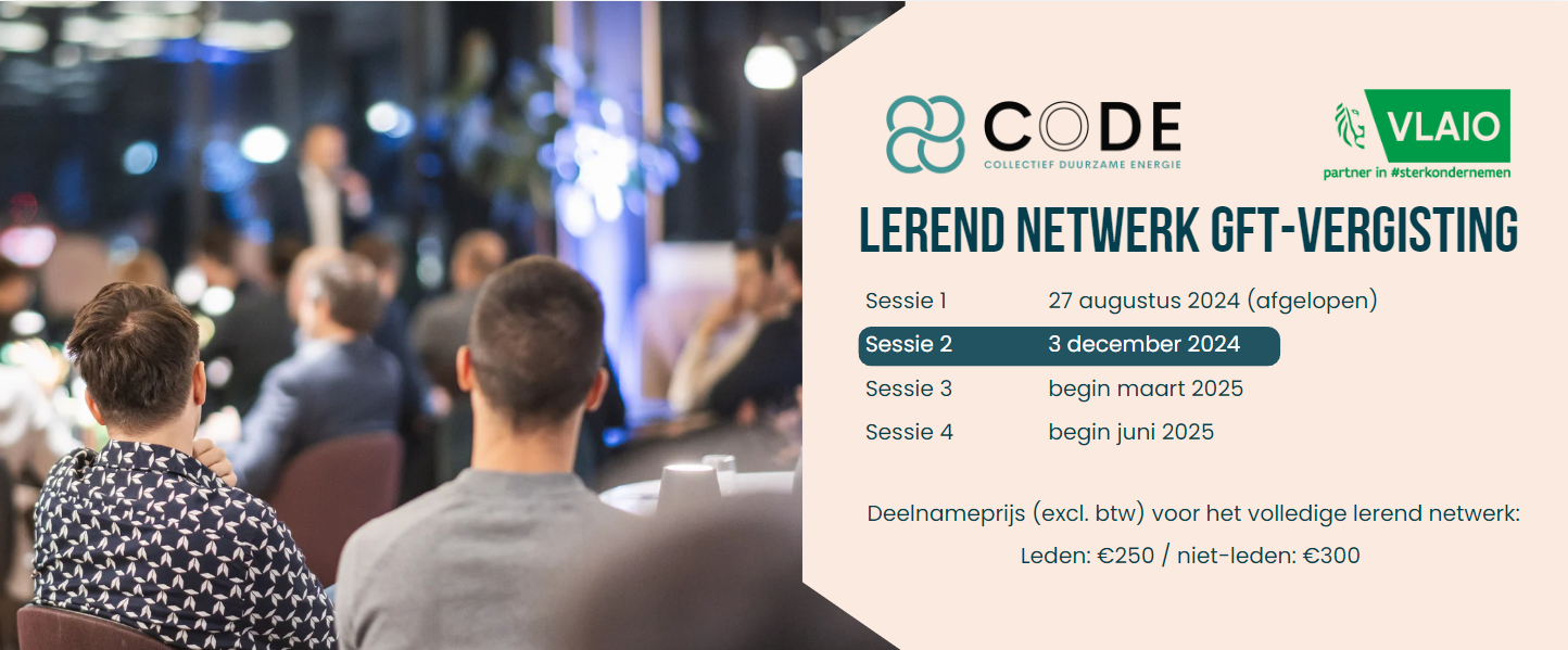 Het Collectief Duurzame Energie (CoDE) nodigt u van harte uit voor het eerste Lerend Netwerk omtrent GFT-vergisting, getrokken door Biogas-E. Als onderdeel van het VLAIO-netwerk richten we ons op het ondersteunen van bedrijven in hun zoektocht naar het vergroenen van energiedragers. Onze focus ligt op samenwerking en het omarmen van innovatieve oplossingen om uw bedrijf te helpen groeien en verduurzamen.