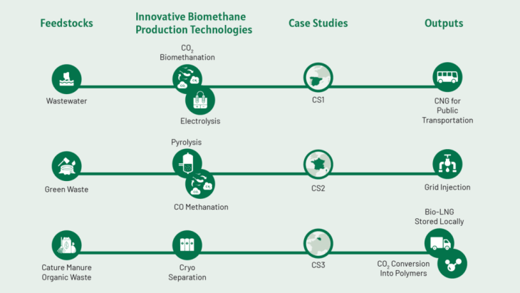 - Green Waste Treatment Plant (France): small-scale green waste-to-biomethane plant using an innovative combination of pyrolysis and bio-methanation to produce biogas, which will be upgraded and injected into the grid